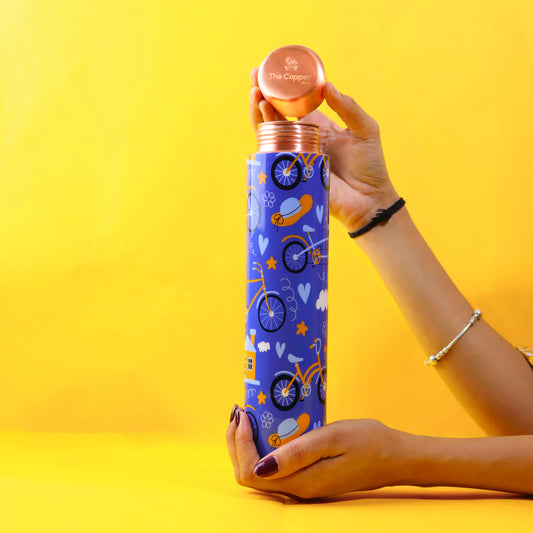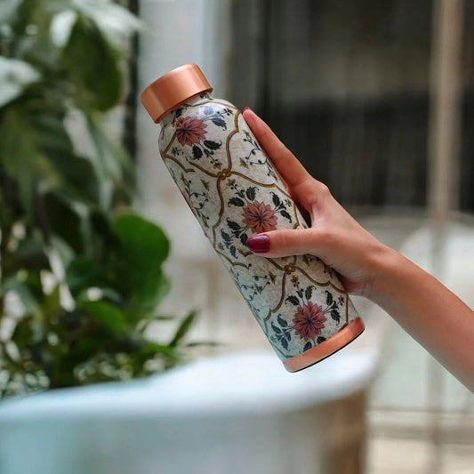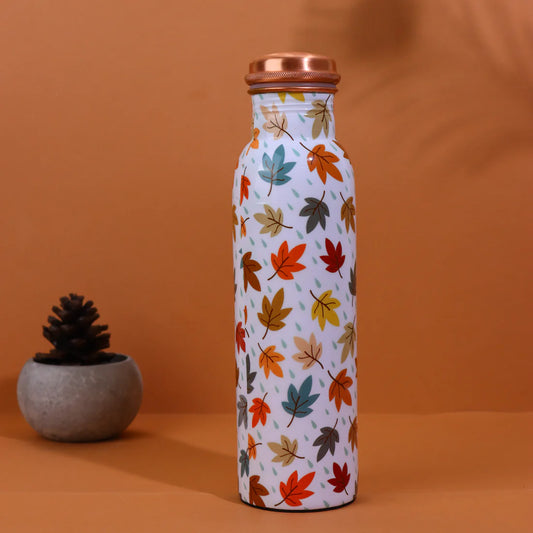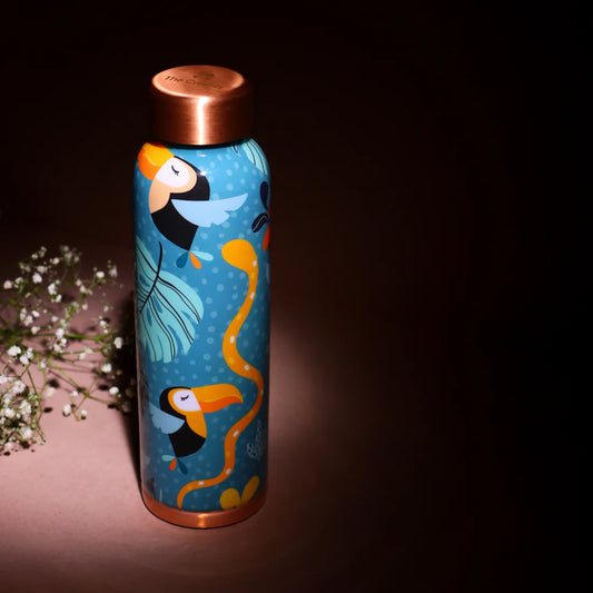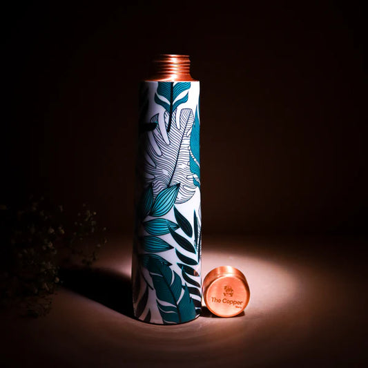 Azure Leaf & Bird Print Pure Copper Water Bottle