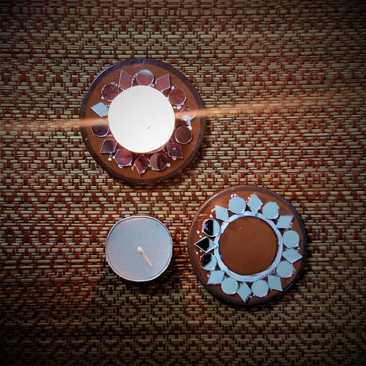 Kutch Pottery Mirror Work Tealight Holder Round (Set of 2)