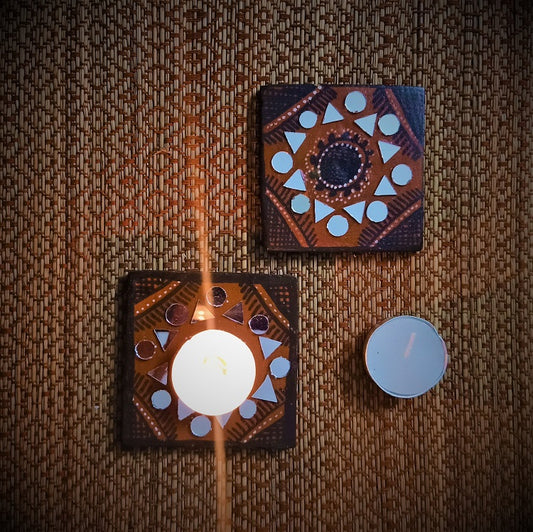 Kutch Pottery Mirror Work Tealight Holder Square Small (Set of 2)