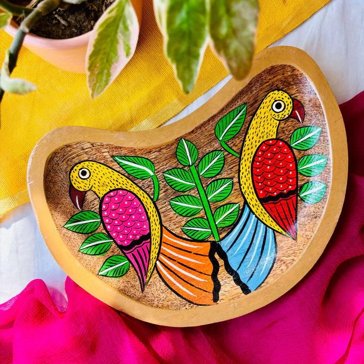 Our moon shaped wooden platters are made of pure mango wood native to India. The platters, flawlessly crafted by the celebrated woodworkers of Saharanpur, are elevated by the Pattachitra motifs painted by generational artists of Pingla.