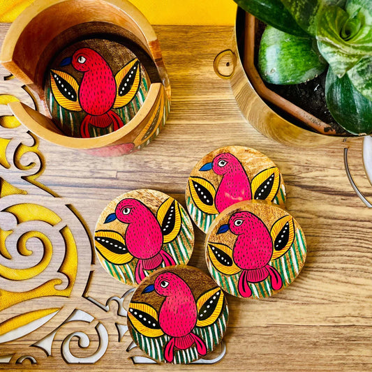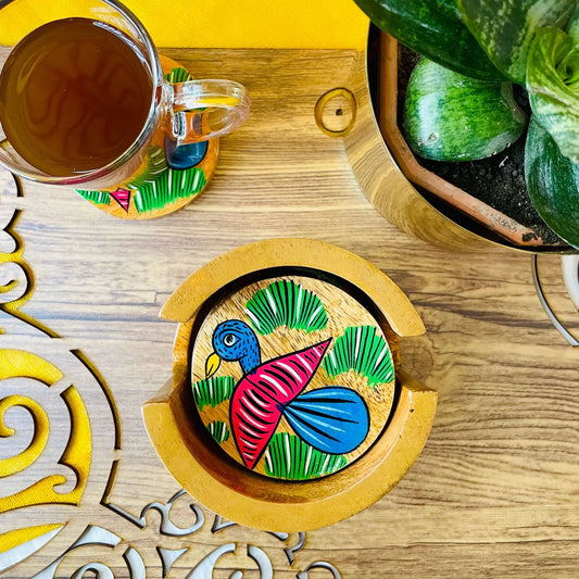 Pihu Round Wooden Coaster with Holder | Set of 6